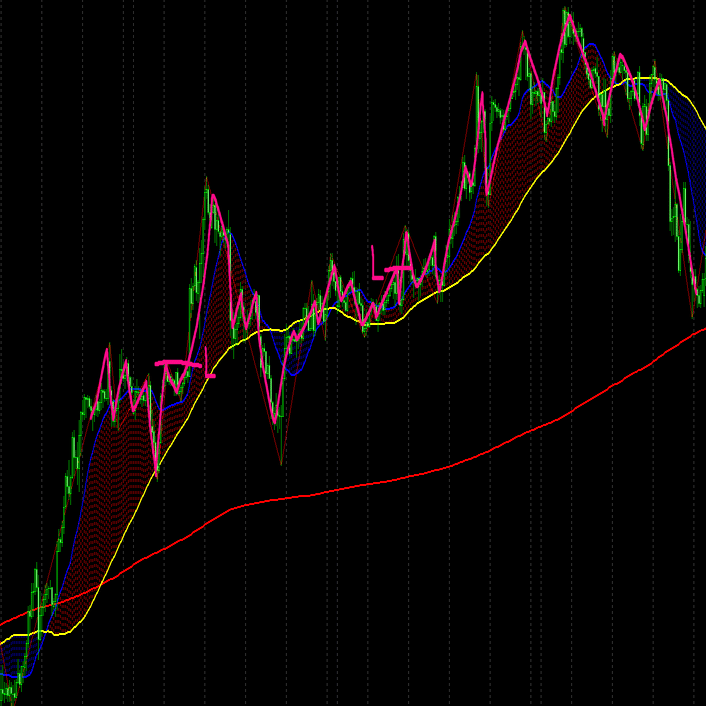 1時間足チャートで4時間足ダウを描くとこうなります。