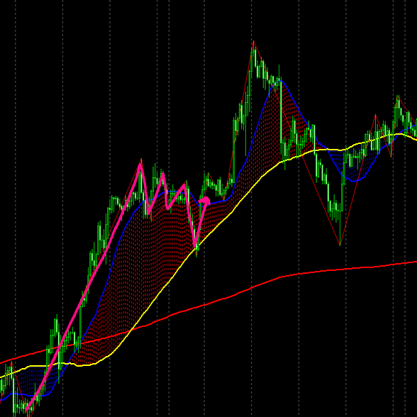 次に1時間足チャートに表示した4時間足20MA相当の80MA(黄色線)から4時間足ダウを引くとどうなるでしょうか。