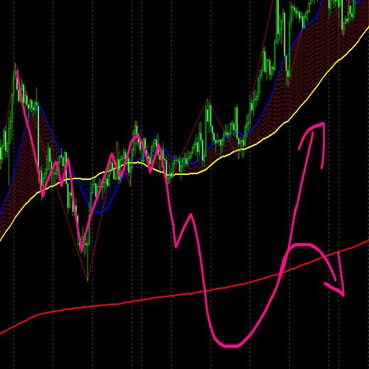 - ③更にもっと内側に入り込んできて480MAに収束し、「1時間足&4時間足で見た下降トレンド」「日足で見た修正波」