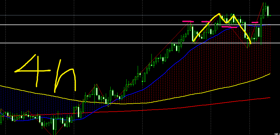 4時間足ではダブルトップを形成し、ネックラインをブレイク。
