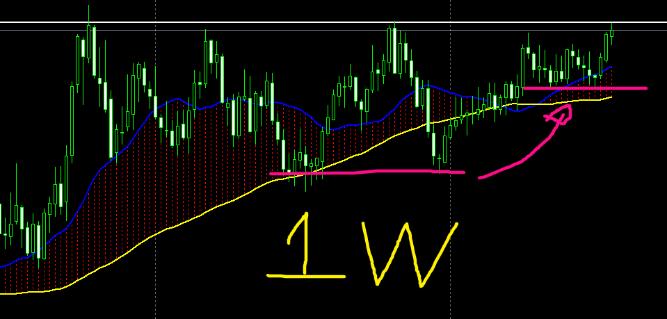 週足では安値を切り上げてきており、MAも収束→拡散が起こりそうな局面です。