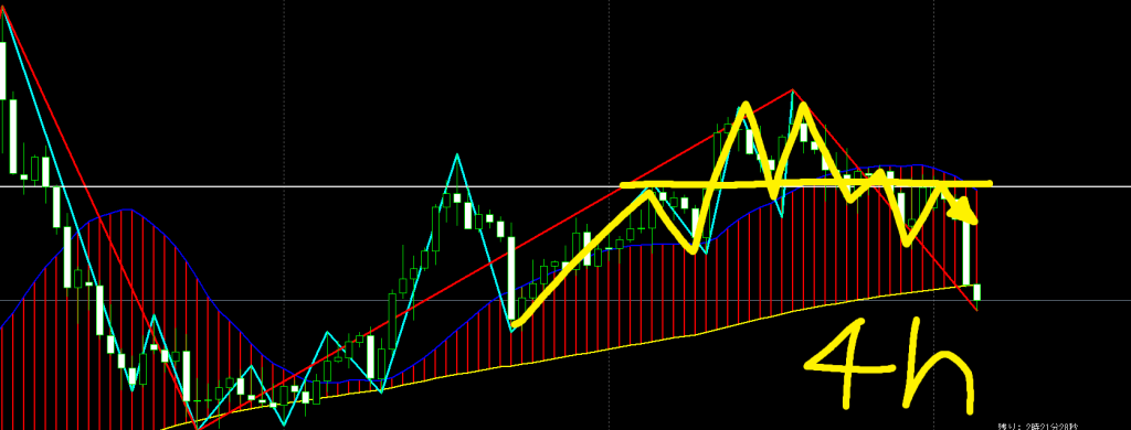 - 4時間足でダブルトップを形成後ネックラインをブレイク。