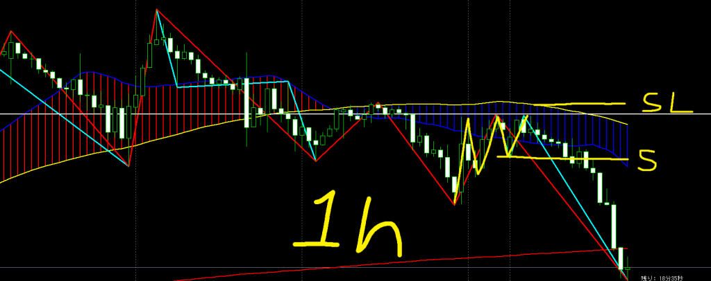 - 1時間足ネックライン(ピンク線)で反発してくることは予想出来ていたが、ブレイクする自信が持てずSLを建値に移動(一応安値更新した高値)