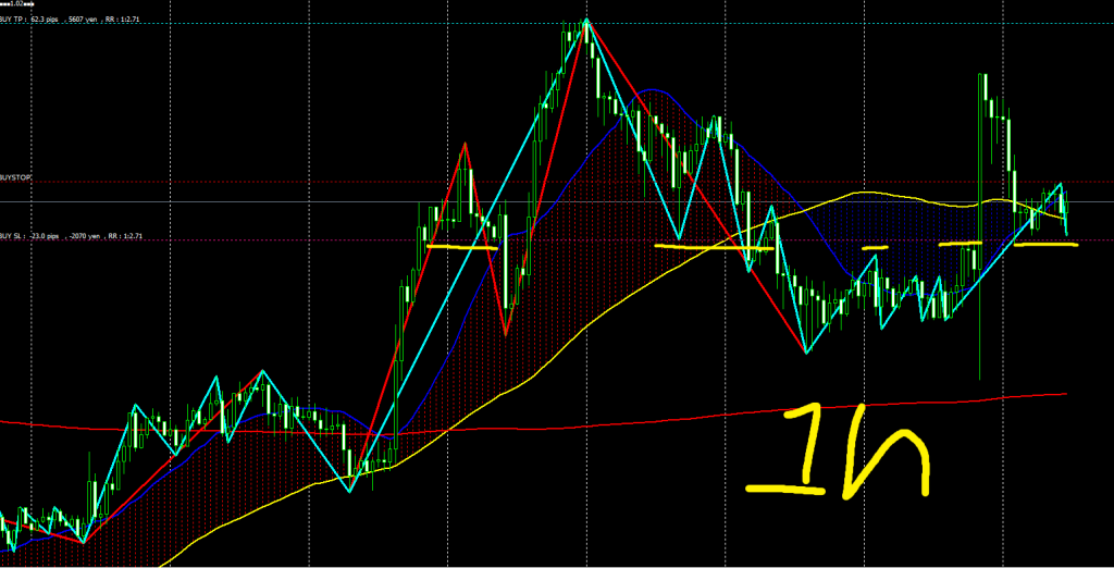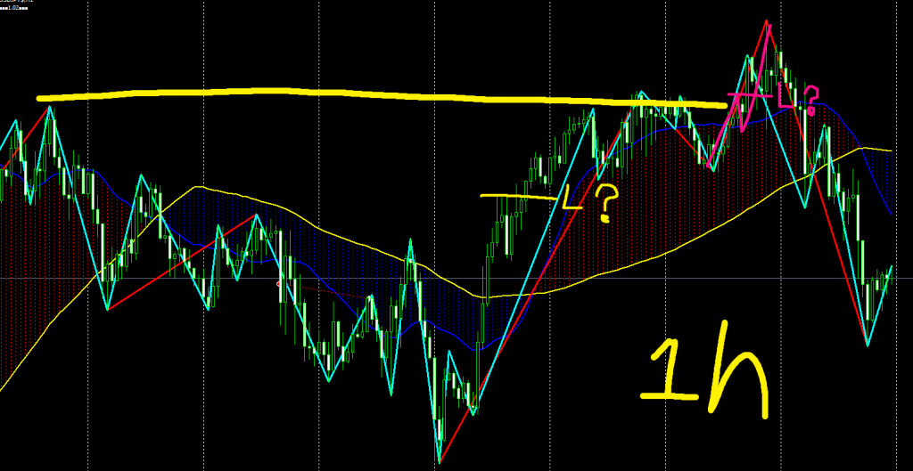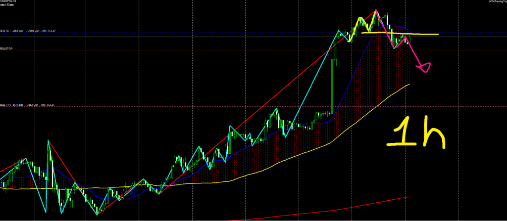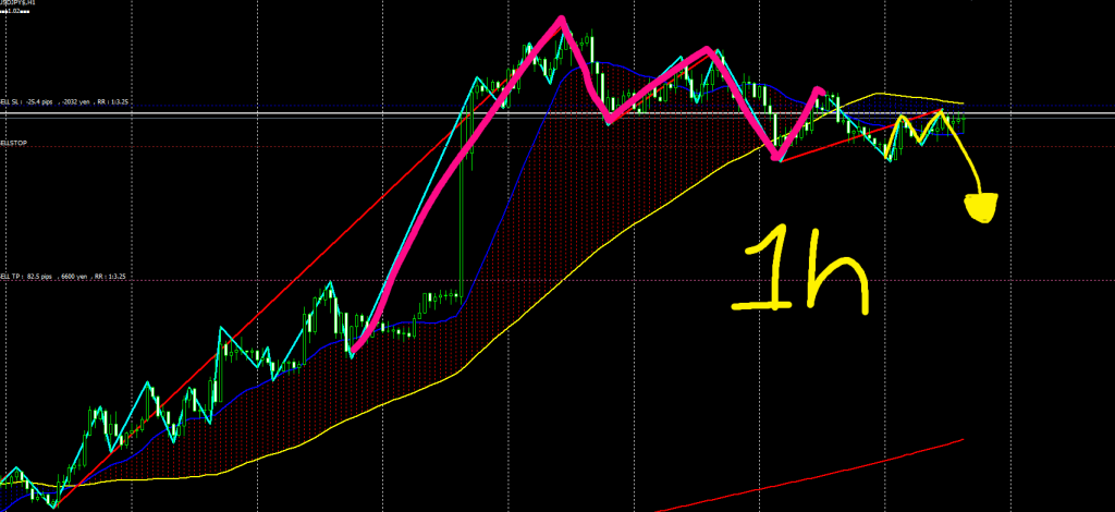 - 4時間足の安値ラインで1時間足がダブルトップを形成